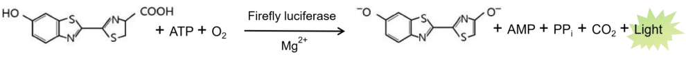 萤火虫萤光素酶(Fireflyluciferase)是一种分子量约为61kDa的蛋白,在ATP、镁离子和氧气存在的条件下,能够催化萤光素(luciferin)氧化成oxyluciferin,在氧化的过程中会发出波长为560nm左右的生物萤光。