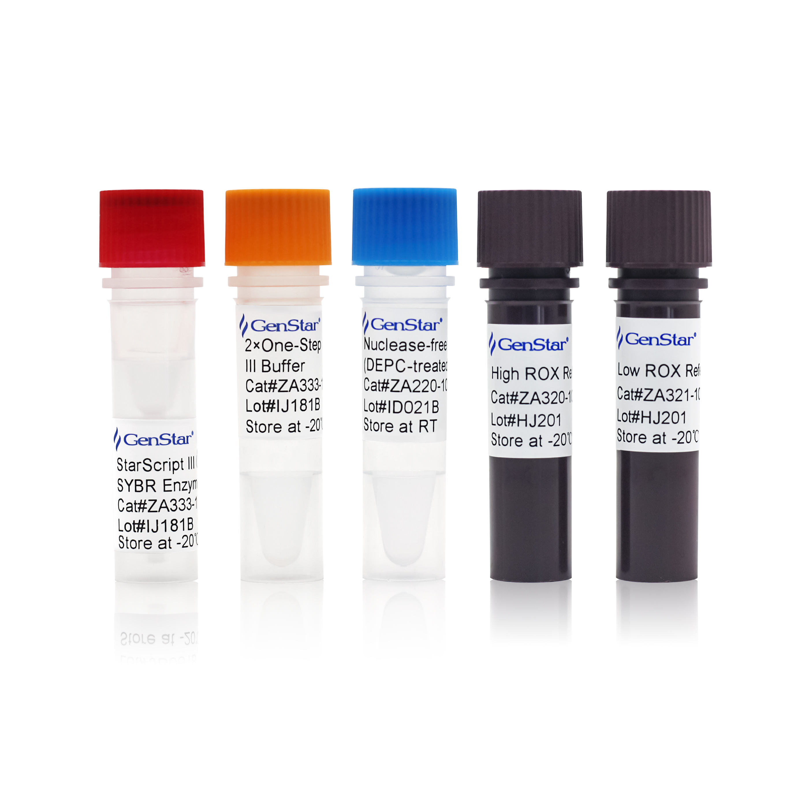 StarScript III One-Step qRT-PCR SYBR Kit 是采用 SYBR Green I 嵌合荧光法进行一步法实时荧光定量检测的专用试剂盒。使用本制品进行 Real Time RT-PCR 反应时以提取的 RNA 为模版,在同一反应管内连续进行反转录和荧光定量检测,操作简单,并能有效防止污染。基于 StarScript III 反转录酶、抗体型 HotStart Taq DNA 聚合酶、配合优化的 Buffer 体系,对于二级结构复杂和 GC 含量高的 RNA 模板扩增效果好,非常适合于 RNA 病毒等微量目标基因的检测。